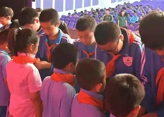有一种颜色,飘扬在心中永不褪色,那是红领巾的颜色!有一种爱,不同于父母的骨肉之亲,不是与老师的师生之情,那是学姐学长与学弟学妹的爱,温暖人心!鲜艳的红领巾,飘扬在前胸,那是学长学姐为我戴上的!